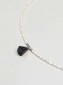 Adjustable bracelet-necklace made of synthetic thread with a central decorative element made of leather. It is part of Seeds Collection.